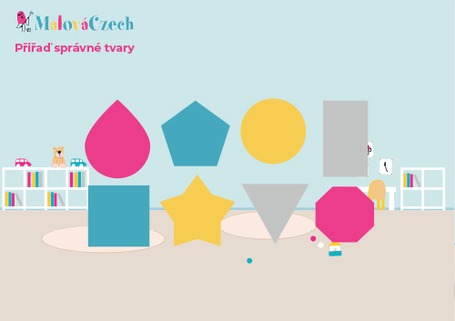 MalíCzech skládá tvary. PDF je rozděleno na tři stránky. První stranu zalaminovat, polepit suchým zipem. Druhou stranu vystříhat, poté jednotlivé části zalaminovat a z druhé strany polepit suchým zipem. Třetí část vytisknout a zalaminovat. Tyto části přiřadí podle tvaru na správnou část.