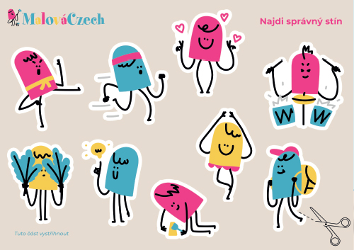 MalíCzech hledá správný stín. Tato čtvrtá část Quiet booku je rozdělena na tři části - A, B, C - každá má své PDF. Třetí část C vytisknout a zalaminovat. Tyto postavičky se přiřadí na správný stín.