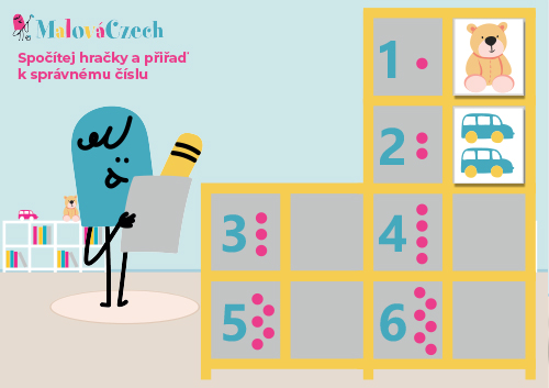 MalíCzech počítá. PDF je rozděleno na tři stránky. První stranu zalaminovat, polepit suchým zipem. Druhou stranu vystříhat, poté jednotlivé části zalaminovat a z druhé strany polepit suchým zipem. Třetí část vytisknout a zalaminovat. Tyto části se podle počtu přiřadí vedle správného čísla.