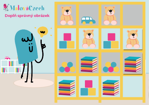 MalíCzech potřebuje uklidit pokoj. PDF je rozděleno na dvě stránky. První stranu zalaminovat, polepit suchým zipem. Druhou stranu vystříhat, poté jednotlivé části zalaminovat a z druhé strany polepit suchým zipem. Tyto části se z koberce "uklízí" do polic/na stůl/zeď.