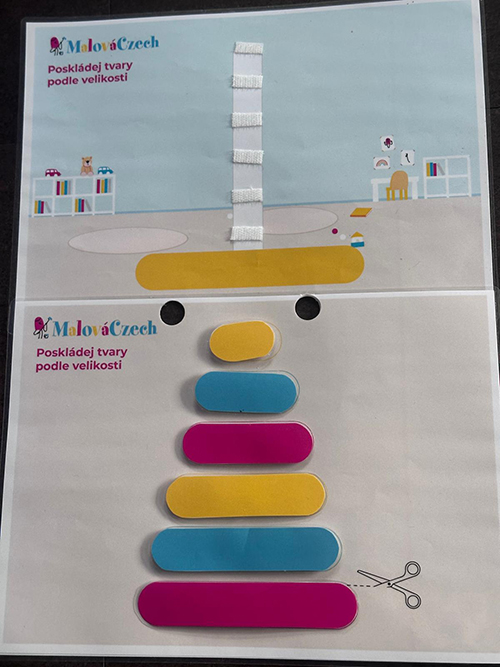 MalíCzech skládá tvary. PDF je rozděleno na tři stránky. První stranu zalaminovat, polepit suchým zipem. Druhou stranu vystříhat, poté jednotlivé části zalaminovat a z druhé strany polepit suchým zipem. Třetí část vytisknout a zalaminovat. Tyto části přiřadí podle tvaru na správnou část.